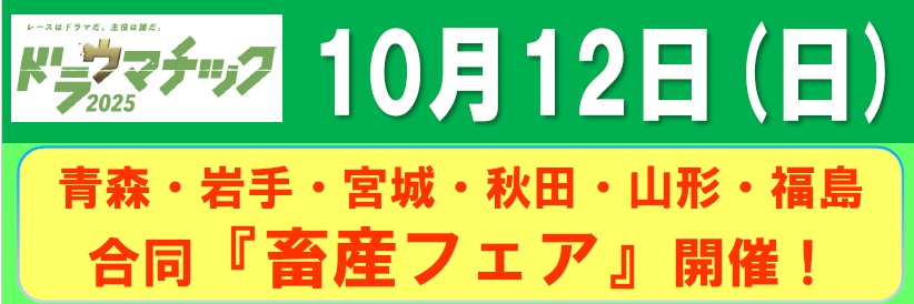 地方競馬の普及啓発及び県産畜産物の消費拡大を図ることを目的に、競馬場来場者への畜産加工品等を無料で配布します!                                                   この「畜産フェア」は東北6県の畜産協会が主催し、毎年秋に盛岡競馬場で開催している大人気のイベントです。   毎年楽しみにしてくれている、競馬ファンのみなさん、初めてイベントを知ってくださった皆さん、盛岡競馬場でお待ちしております☆